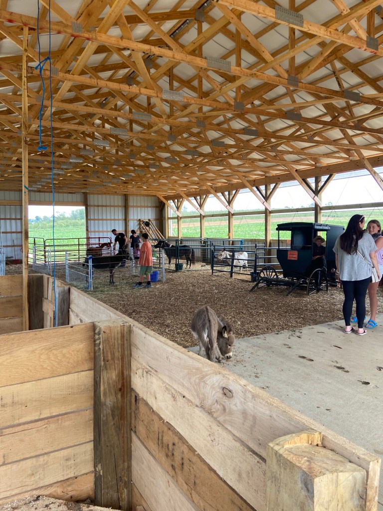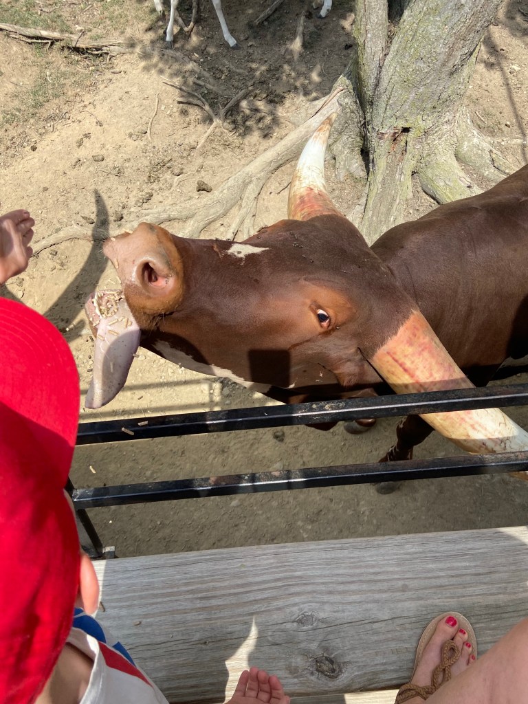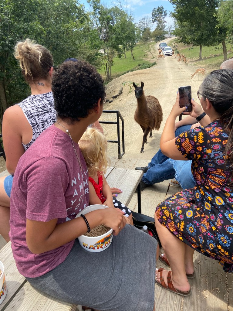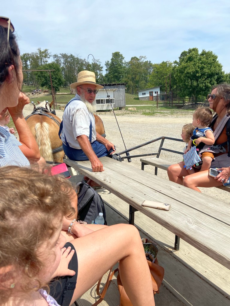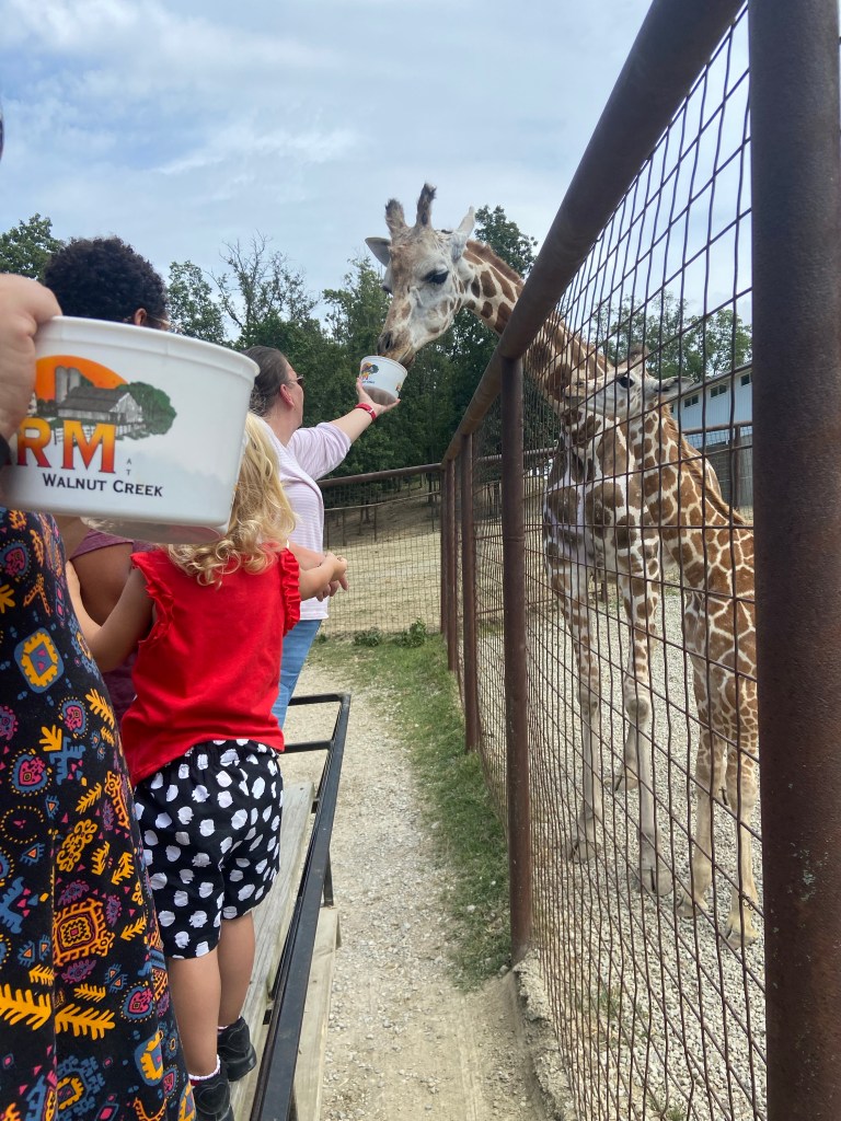Am Samstag ging’s ihm aber soweit wieder besser und da Sascha mit ein paar Arbeitskollegen Dragonboat fahren war, haben wir zu dritt einen Ausflug gemacht. Ca. 45 Minuten südlich von uns gibt es die Walnut Creek Farm, eine von Amish betriebene Farm mit vielen unterschiedlichen Tieren, sowohl heimischen wie Rehe, Büffel, Lamas aber auch exotischen Tieren wie Zebras, Giraffen und Kamelen…man kann entweder selbst mit seinem Auto durchfahren oder – so wie wir – mit einem Pferdewagen. Das war echt toll und die kids hatten eine Menge Spaß. Vor allem Oskar hat jedes Tier ohne Berührungsängste gefüttert.
